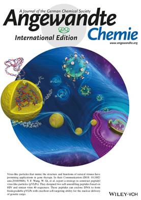 近日,齐崴教授团队根据艾滋病(HIV)病毒囊膜蛋白gp120上的V3多肽与猿猴空泡(SV40)病毒大T抗原蛋白的核定位序列(PKKKRKV, NLS),通过分子与纳米仿生,设计了两种具有跨细胞膜与核膜的功能多肽,并调控其组装形成仿病毒纳米颗粒。该颗粒可作为“特洛伊木马”,携带核酸类基因药物,以类似病毒的跨膜方式将药物靶向运送至具有CD4/CCR5趋化因子受体的免疫细胞内,相关研究可为病毒性疾病的靶向基因治疗提供有益参考。工作发表在《Angewandte Chemie-International Edition》,并被遴选为Inside Cover。论文标题为Rationally designed peptidyl virus-like particles enable targeted delivery of genetic cargo,出版网址为https://onlinelibrary.wiley.com/doi/abs/10.1002/anie.201805868。
