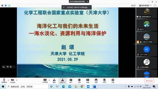 然后,赵颂副研究员做了题为“海洋化工与我们的未来生活”的科普报告。介绍了海水淡化技术(热法和膜法)的原理、研究热点和未来的发展方向,以及膜法海水提锂技术的现状与进展。